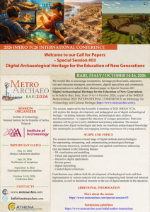 Позивамо истраживаче, стручњаке за културно наслеђе, наставнике, управљаче локалитетима и музејима, практичаре, дигиталне стручњаке и представнике заједнице да поднесу своје апстракте/радове за Специјалну сесију #03 Дигитално археолошко наслеђе за образовање нових генерација, која ће се одржати у Барију, Италија, од 14. до 16. октобра 2026. године, у оквиру Међународне конференције IMEKO MetroArchaeo 2026 о метрологији за археологију и културно наслеђе (https://www.metroarcheo.com/).